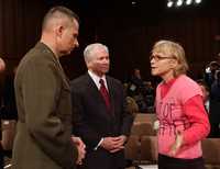 La activista estadunidense contra la guerra en Irak Gael Murphy enfrenta en el Capitolio al general Peter Pace y al nuevo jefe del Pentágono, Robert Gates, ayer en Washington