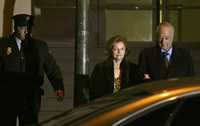 Isabel Perón, acompañada por un policía y un hombre no identificado, a su salida, ayer, de la Audiencia Nacional, en Madrid