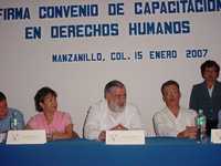 El presidente de la Comisión Nacional de los Derechos Humanos, José Luis Soberanes Fernández, informó, en gira de trabajo por Colima, que este martes expondrá ante diputados que integran la comisión especial sobre el caso Pasta de Conchos, el contenido y los pormenores de la recomendacción 26/2006, la cual establece diversas violaciones a las garantías fundamentales de los afectados, cometidas por funcionarios de la Secretaría del Trabajo y Previsión Social; entre otras, conductas omisas y negligentes. Este lunes firmó convenios de trabajo; en la imagen, con la senadora Martha Sosa Govea y el ombudsman local, Enrique González García