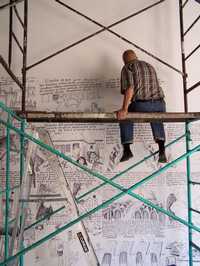 Arriba, el artista plasma su vida en la pared; abajo, parte de la obra ya terminada