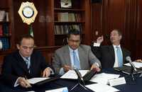 El secretario de Seguridad Pública capitalino, Joel Ortega, al centro, renovó ayer el convenio con la Oficina Coordinadora de Riesgos Asegurados, para combatir el robo de autos. En el acto se entregaron seis nuevos equipos de cómputo que permitirán a la corporación policiaca duplicar su capacidad de lectura de placas con reporte de hurto. José Arturo Morales Morales, presidente de la Asociación Mexicana de Instituciones de Seguros refrendó su compromiso de trabajar conjuntamente con la SSP-DF en esa tarea