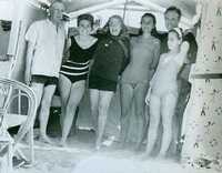 Borges, María Esther Vázquez, Silvina Ocampo, Cecilia Boldarín, Adolfo Bioy Casares y Marta Bioy en Mar del Plata, el 21 de febrero de 1964.