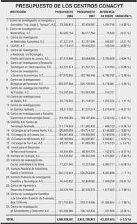 En el caso de los 25 Centros Públicos de Investigación, el año pasado recibieron un presupuesto de 2 mil 885 millones 78 mil 587 pesos, y para 2007 la cifra se redujo a 2 mil 812 millones 720 mil 972 pesos. En términos globales, la AMC recordó que en los últimos seis años el presupuesto federal para estos rubros paulatinamente ha venido a la baja, al pasar de 0.42 por ciento del PIB, en 2000, a 0.37 en 2006.