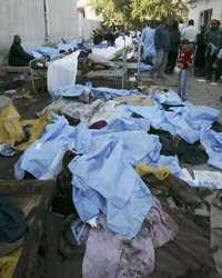 Afuera del hospital Kindi, en Bagdad, yacen los cuerpos amontonados de las víctimas de un doble atentado con coche bomba perpetrado cerca de un mercado ayer, en pleno centro de la capital de Irak