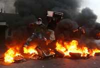 Manifestantes libaneses saltan por encima de barricadas incendiadas en la sureña ciudad de Sidon, durante protestas que paralizaron Líbano