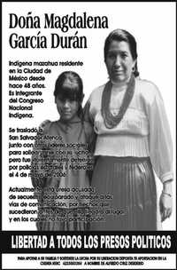 Pese a que la justicia federal concedió un amparo a Magdalena García Durán, detenida a raíz del operativo policiaco en San Salvador Atenco, la indígena mazahua continúa recluida en el penal de Santiaguito y no podrá obtener su libertad debido a que el juez segundo de lo penal de Toluca, Jaime Maldonado quien conoce del caso, decretó un tercer auto de formal prisión en su contra.