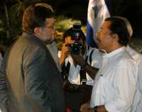 Daniel Ortega, presidente de Nicaragua (derecha), y Paul Trivelli, embajador estadunidense, luego de una reunión del cuerpo diplomático acreditado en Managua con el también líder sandinista