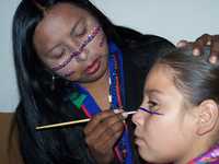 Alamos, Son., 27 de enero. El color blanco simboliza buena suerte. El azul representa el mar. El rojo, la sangre. Los dibujos hablan de la naturaleza, las mujeres, el desierto, los antepasados, la vida... Niños y niñas muestran fascinados las imágenes que adornan sus rostros flores, flechas, triángulos, círculos y explican lo que acaban de aprender en el taller de pintura facial seri que tomaron en el mercado de artesanías de Alamos.