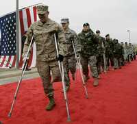 Soldados estadunidenses heridos en combate llegan a una base militar en San Antonio a la presentación de lo que serán los nuevos centros de rehabilitación de alta tecnología que habrá en Estados Unidos para atender a todos los efectivos mutilados en la guerra