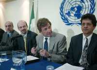 El director general del CIDE, Enrique Cabrero; el representante del Banco Mundial en México, Daniel Boyce; el representante del Banco Interamericano de Desarrollo, Lawrence Harrington, y el director de la Cepal en Máxico, Jorge Máttar, ayer en conferencia de prensa
