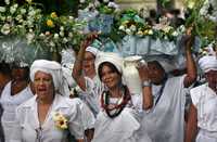 Miembros de sectas religiosas brasileña llevan ofrendas a Yemanja, deidad africana del agua, ayer en Río de Janeiro. Miles de personas fueron a la playa con flores, perfumes y joyas