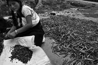 Una mujer desenvaina frijol en la carretera a San Andres Larráinzar, Chiapas