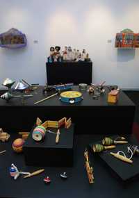 Junto, en latón, un tren, una rueda de la fortuna, una avioneta y una carretilla que hace girar un dos veces simulado cohete de juego mecánico. Más allá, baleros y trompos de madera, perros y palomas de barro, jícaras y sonajas laqueadas.
