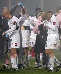 Jugadores del Palermo se lavan los ojos ante las molestias que les ocasionaron los gases lacrimógenos lanzados por la policía