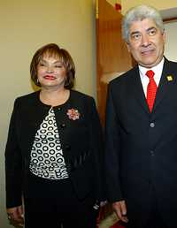 Elba Esther Gordillo Morales y el titular de Gobernación, Francisco Ramírez Acuña, al llegar a Bucareli