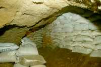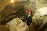Dos aspectos de las obras de reforzamiento y apuntalamiento que se realizan en las cavernas encontradas bajo la colonia Las Golondrinas, en la delegación Alvaro Obregón