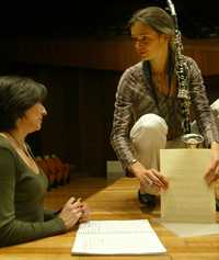 Ana Lara y Tara Bouman durante el ensayo, con la Orquesta Filarmónica de la UNAM, del Concierto para corno di bassetto, que la compositora mexicana escribió ex profeso para la clarinetista holandesa, cuyo estreno mundial será este sábado y domingo