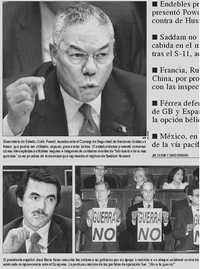 ¿Nadie lo sabía? Pero cuán mentiroso sigue siendo usted, José María. En aquellos días de 2003 todavía paseaban por las calles y tomaban el sol decenas de miles de personas que desde entonces han muerto en el conflicto, y en enero de ese año el jefe de inspectores de la ONU en Irak, Hans Blix, dijo que su equipo no había hallado rastros de tales armas. Es cierto que Colin Powell fue a la ONU a mostrar unas fotos borrosas (igual podían ser el patio de mi casa visto desde el espacio que el close-up de una hamburguesa podrida) y un frasquito que "habría podido ser utilizado", dijo, para efectuar envíos de ántrax a domicilio.