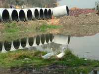 Obras del megacolector de aguas residuales en el lago de Guadalupe, que según vecinos de Cuautitlán Izcalli, sólo servirán para los nuevos desarrollos habitacionales