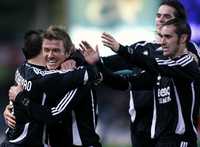 Beckham es felicitado por sus compañeros en su reaparición con los Merengues, juego en el que anotó un gol