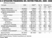 Según el Informe de Hacienda, el Congreso autorizó en el Presupuesto para 2006 un ingreso (y un gasto) por 1 billón 953 mil 500 millones (1 billón 973 mil 500 millones según la Ley de Ingresos publicada en el Diario Oficial de la Federación el 14 de diciembre de 2005), cifra que fue rebasada ampliamente durante el año: los ingresos reales fueron superiores en 310 mil millones (15.9%) a lo presupuestado autorizado, y los gastos reales en 302 mil millones (Gráfico 1).