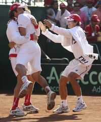 El ruso Igor Andreev (centro) es felicitado por sus compañeros de equipo Teimuraz Gabashvili e Igor Kunitsin tras derrotar al chileno Nicolás Massu y eliminar a los sudamericanos de la Copa Davis