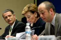 El panista Carlos Abascal, la priísta Rosario Green y el académico de la UNAM Pedro Salazar escuchan, ayer, protestas de simpatizantes de Andrés Manuel López Obrador y de la APPO, durante el seminario Constitución, democracia y elecciones, que se desarrolla en el Instituto de Investigaciones Jurídicas de la máxima casa de estudios
