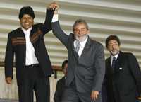 El presidente de Brasil, Luiz Inacio Lula da Silva, levanta el brazo de su contraparte de Bolivia, Evo Morales, en el palacio de Itamaraty, en Brasilia, tras lograrse un acuerdo sobre el gas