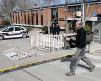 Un trabajador instala vallas frente a la Audiencia Nacional, a horas del inicio del macrojuicio