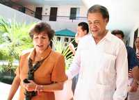 Ana Rosa Payán Cervera y el dirigente nacional del Partido del Trabajo, Alberto Anaya, luego del acto en que la ex panista rindió protesta como candidata de ese instituto a la gubernatura de Yucatán