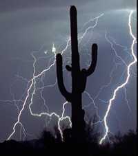 El rayo estudiado se convirtió en vidrio, o fulgurita, en el lenguaje científico, explican. En la imagen, un cactus saguaro dibuja su silueta en medio de una tormenta eléctrica en el desierto de Arizona