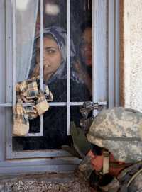 Una joven iraquí observa a un soldado estadunidense que vigila los alrededores de su hogar durante un operativo en el barrio Shaab, en Bagdad, en busca de militantes de la resistencia