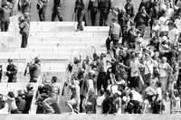 La más reciente bronca ocurrió en la tribuna general del Tec, en un juego Monterrey-Chivas, con saldo de un policía herido y cinco detenidos.
