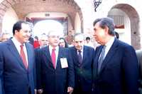 El mandatario michoacano Lázaro Cárdenas Batel, Alejandro Carrillo Castro, presidente del INAP-México, Raúl Ricardo Alfonsín, presidente de la Fundación para la democracia, en el cuarto Foro Internacional Michoacán-Gobernabilidad y Desarrollo Democrático, ayer en Morelia