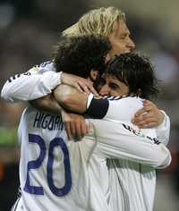 El argentino Gonzalo Higuaín (20) marcó su primer gol con los Merengues para darle el empate 1-1 ante los Colchoneros; lo felicitan Raúl González (derecha) y Miguel Salgado