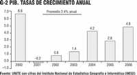 Este crecimiento de 4.8% fue el más alto logrado en el sexenio, el cual inició con un decrecimiento de -0.2% en 2001, para de ahí crecer 0.8% en 2002, 1.4 en 2003, 4.2 en 2004 y 2.8 en 2005. El crecimiento acumulado en todo el sexenio fue de 14.5%, esto es, un crecimiento promedio anual de 2.4% (Gráfico 2).