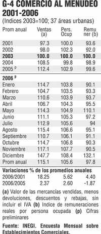 De acuerdo con la Encuesta sobre Establecimientos Comerciales que mensualmente realiza el INEGI en 37 áreas urbanas del país, las Ventas al menudeo aumentaron 2.37% en 2006, el Personal ocupado creció 2.6%, y las Remuneraciones reales promedio por persona ocupada descendieron -1.87% (Gráfico 4). Cabe mencionar que con el cambio del año base a 2003, los nuevos índices inician en 2001 e impiden la comparación sexenal.