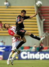 Gerardo Rodríguez (derecha), quien hizo el primer gol del partido, lucha por el balón con Pablo Metlich