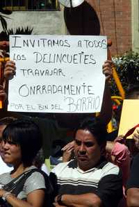 Detrás de ella sus vecinos muestran carteles que rezan: "Invitamos a todos los delincuentes a trabajar honradamente, por el bien de Tepito".
