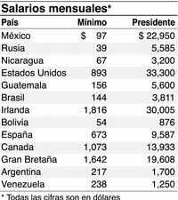 Felipe Calderón no habrá sido la mejor opción para la Presidencia de la República -según lo dijo su compañero de partido Carlos Abascal-, sin embargo, cobra un salario superior a muchos presidentes del mundo. Desde luego, los mandatarios latinoamericanos -Nicaragua, Guatemala, Brasil, Argentina y Venezuela- son unos mal pagados junto al mexicano, cuyos ingresos no están muy lejos de los que percibe el presidente de Estados Unidos. La tabla comparativa que aparece en esta página fue elaborada por Juan Díaz, un mexicano que reside en Georgia, Estados Unidos. Realizó una minuciosa investigación en diferentes fuentes de información.