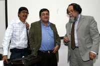 A la izquierda, Pedro López Díaz, autor del Diccionario de la clase política mexicana, coeditado por La Jornada y la Facultad de Economía de la UNAM. Lo acompañan Joel Ortega Juárez y José María Calderón