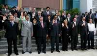 Fotografía oficial de la deslucida conferencia cumbre realizada en Georgetown, en que aparecen en la primera fila Felipe Calderón, Leonel Fernández (República Dominicana), Luiz Inacio Lula da Silva (Brasil), Barraht Jagdeo (Guyana), Michelle Bachelet (Chile), Martín Torrijos (Panamá), Manuel Zelaya Rosales (Honduras) y Daniel Ortega (Nicaragua). Atrás del mandatario guyanés se aprecia al primer ministro de Trinidad y Tobago, Patrick Manning