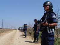 Policías federales y estatales resguardan obras de tendido eléctrico que van del parque eólico La Venta a la subestación de la Comisión Federal de Electricidad en Juchitán
