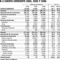 4) La Balanza de Transferencias -la única superavitaria- integrada casi en su totalidad por las remesas que los emigrantes envían a sus familias (23 mil 054 millones de dólares en 2006, 15.1% más que en 2005) (Gráfico 3). Como dato, en el año se registraron 65.8 millones de operaciones de envío con un valor promedio de 350 dólares cada una.