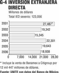 Los otros rubros que integran esta balanza registraron un saldo deficitario conjunto de -3 mil 735 millones, resultado fundamentalmente de los pagos y cobros de utilidades de las empresas con capital extranjero que, en el caso de México, declaran utilidades sumamente bajas por apenas 5 mil 005 millones de dólares (increíble para una inversión que tan sólo en el sexenio pasado sumó 123 mil millones, Gráfico 4) de los cuales según se indica 3 mil 625 fueron reinvertidos en México y 1 mil 380 remitidos al exterior. Cabe recordar, como indica el Bano de México, que en la Balanza de Pagos las utilidades reinvertidas aquí por las empresas extranjeras se contabilizan doble: como un egreso en la Cuenta Corriente por servicios factoriales, y como un ingreso por inversión extranjera directa en la Cuenta de Capital, y