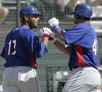 Nelson Cruz (izquierda) felicita al mexicano Miguel Ojeda luego de que el ex cátcher de los Diablos Rojos conectó un jonrón en Tucson