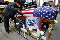 El padre de un soldado muerto el 25 de agosto de 2004, en Najaf, Irak, acomoda fotografías de su hijo frente a un ataúd, durante una manifestación contra la guerra, ayer en Times Square, en la ciudad de Nueva York