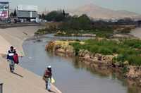 Dos migrantes caminan a las orillas del río Bravo, en la frontera de Ciudad Juárez, Chihuahua, con El Paso, Texas, en su intento por llegar a Estados Unidos