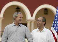 Ampliar la imagen Los presidentes George W. Bush, de Estados Unidos, y Felipe Calderón, durante la ceremonia de bienvenida al mandatario visitante en la Hacienda Temozón Foto: Reuters