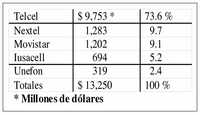 Un estudio realizado por The Competitive Intelligence Unit -su director general es Ernesto Piedras- muestra la relación de fuerzas entre las cinco compañías que ofrecen telefonía celular en México. Telcel, el monopolio de Carlos Slim, el año pasado registró ingresos por 9 mil 753 millones de dólares, que equivalen a 73.6 por ciento del mercado total. Será difícil que esta situación cambie, aun cuando Movistar haya incorporado a sus filas al ex secretario de Hacienda Francisco Gil Díaz y Ricardo Salinas Pliego lleve adelante la fusión de Iusacell y Unefon.